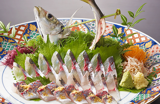 身に脂がのり歯ごたえ十分なあじは、山葵醤油や特製胡麻だれで是非お召し上がりください。