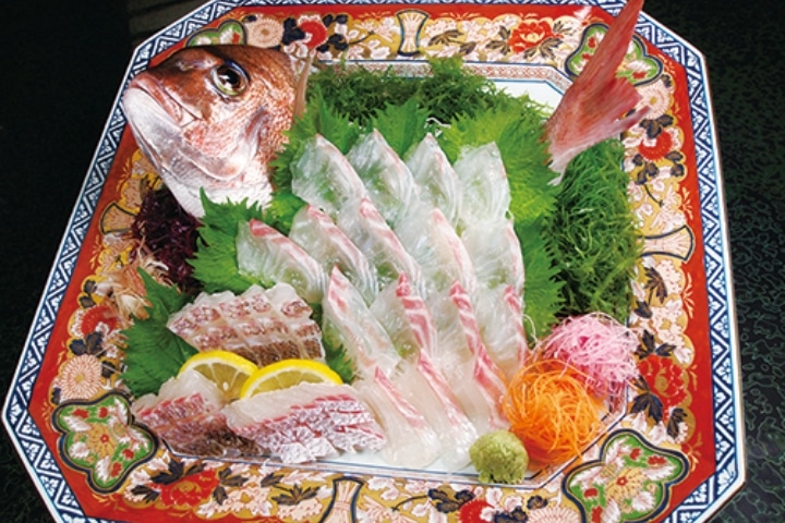 Omakase kaiseki features live fish and other ingredients selected by the chef's discerning eye and served with the chef's sensibility. (with live fish sashimi)
