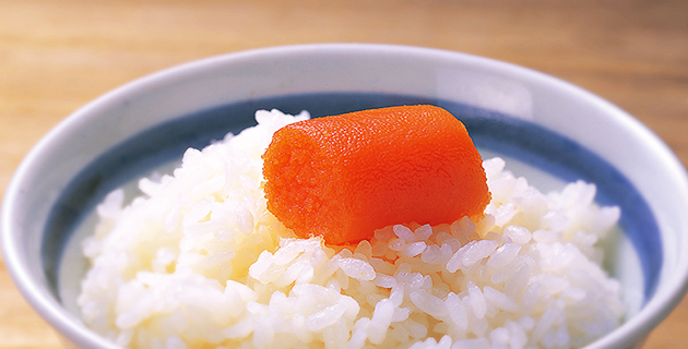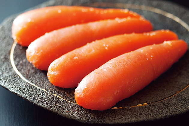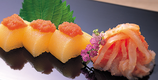 辛子明太子と海の幸、お互いの持ち味を引き立たせる味わい豊かな逸品の数々。料理人の創意工夫と手仕事を挟み込んだ、稚加榮ならではの商品です。
